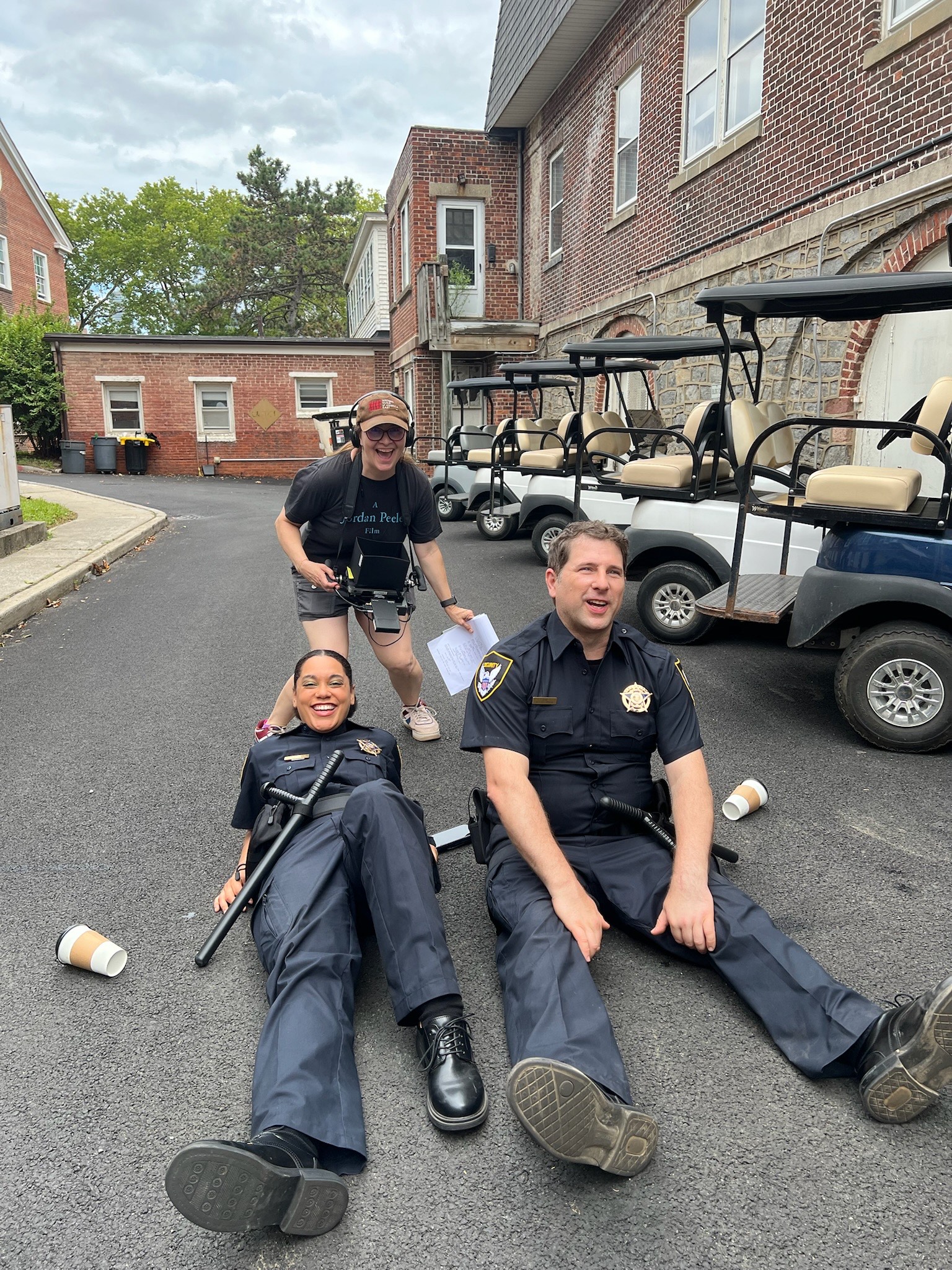 A behind the scenes photo of the director and stars sharing a moment of laughter. The director Carol Ray Hartsell (50, white) stands over Sean (40's white) and Moiya (30, black) who lie stretched out, exhausted, on a small road of the movie lot lined with